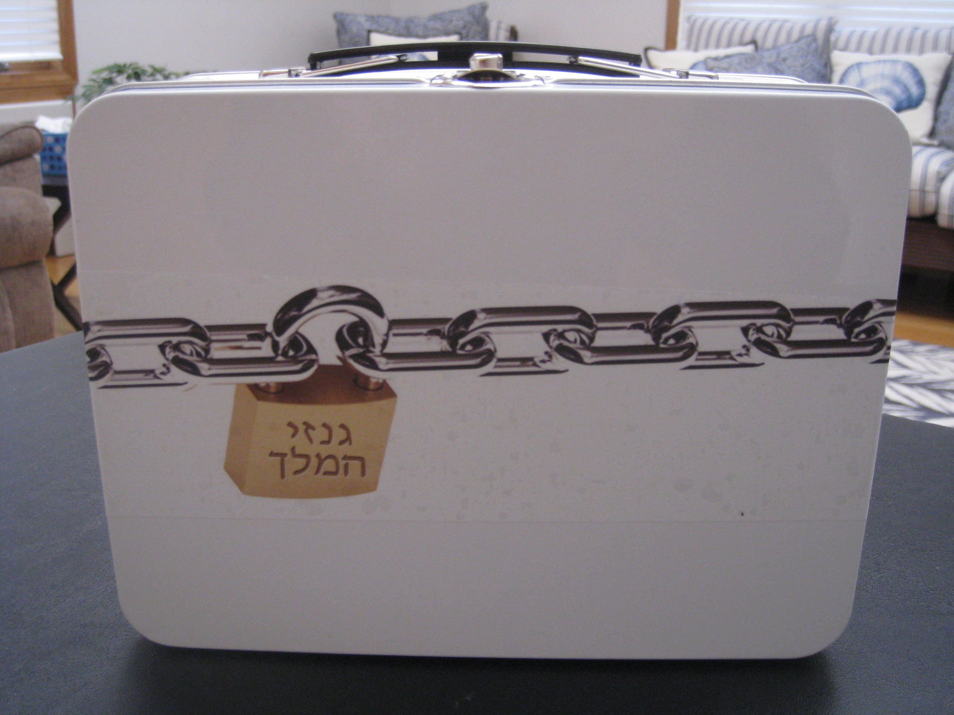 - Solid metal lunch box with label depicting a chain