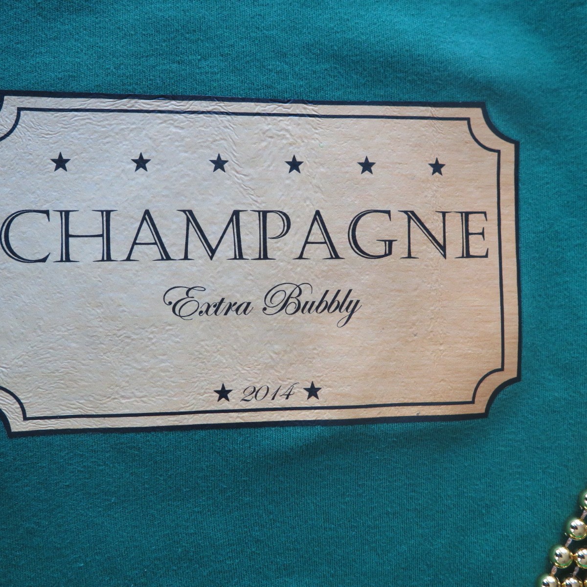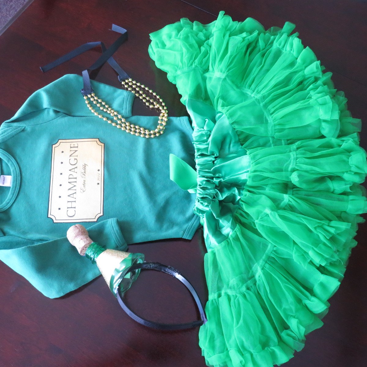 - Green bodysuit with champagne label iron-on decal
