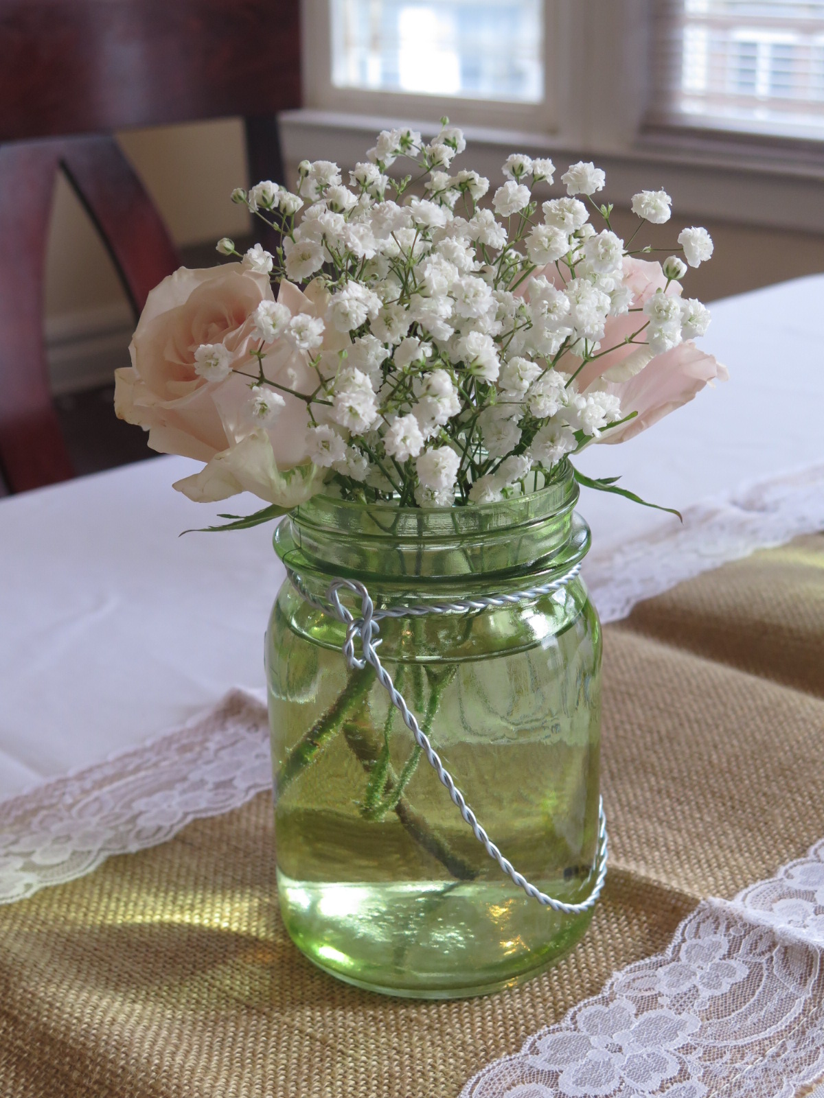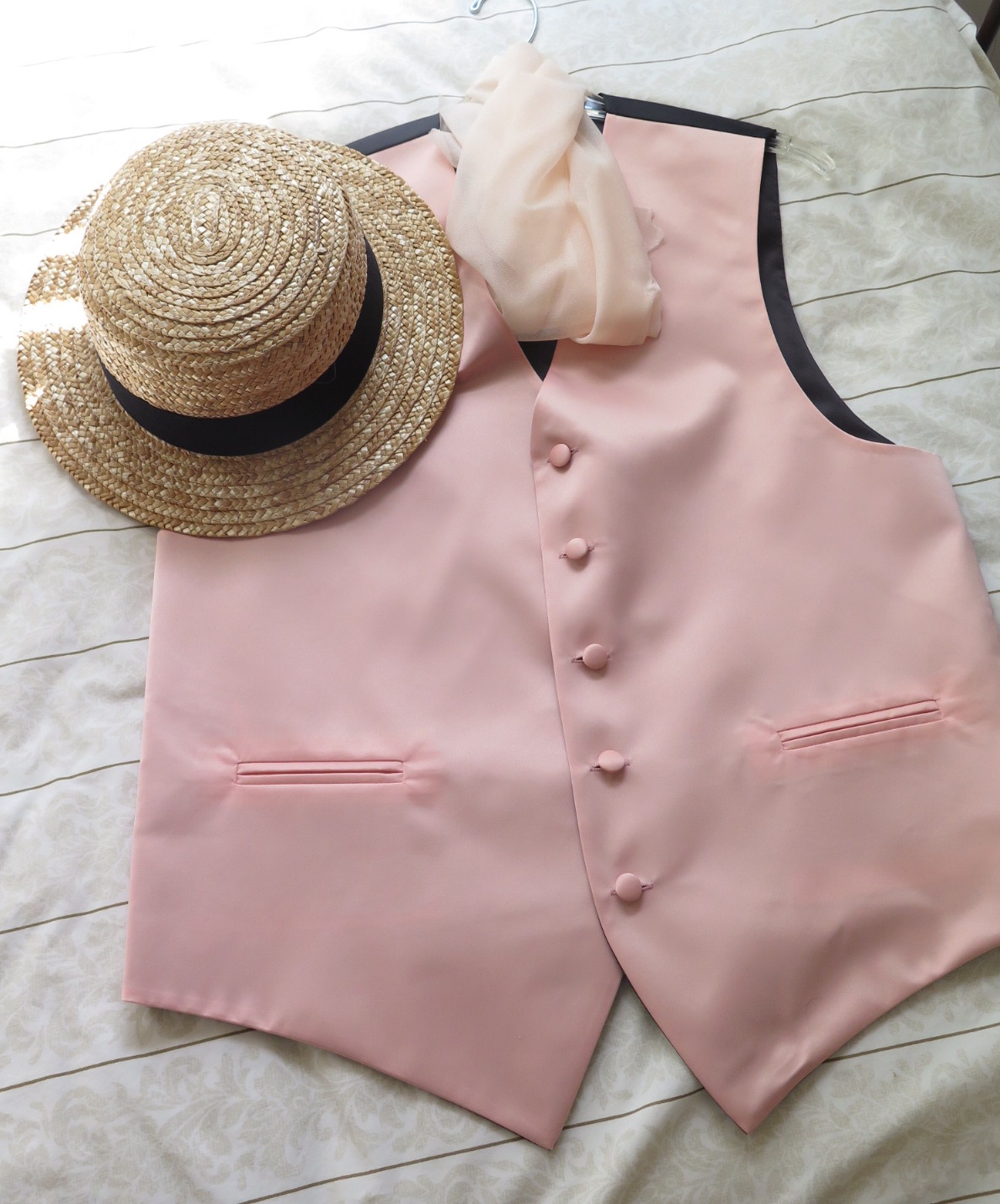Tip: I purchased one soft peach table runner and cut it to be used an ascot and both hat bows.