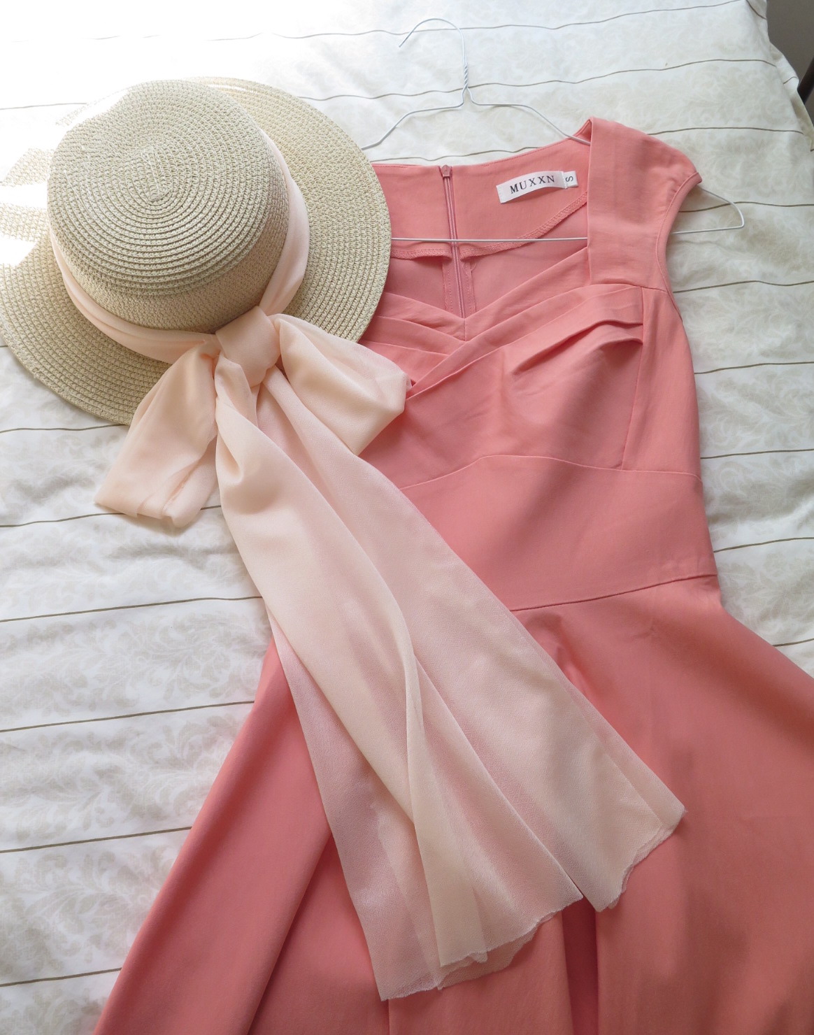 - Straw hat with peach bow