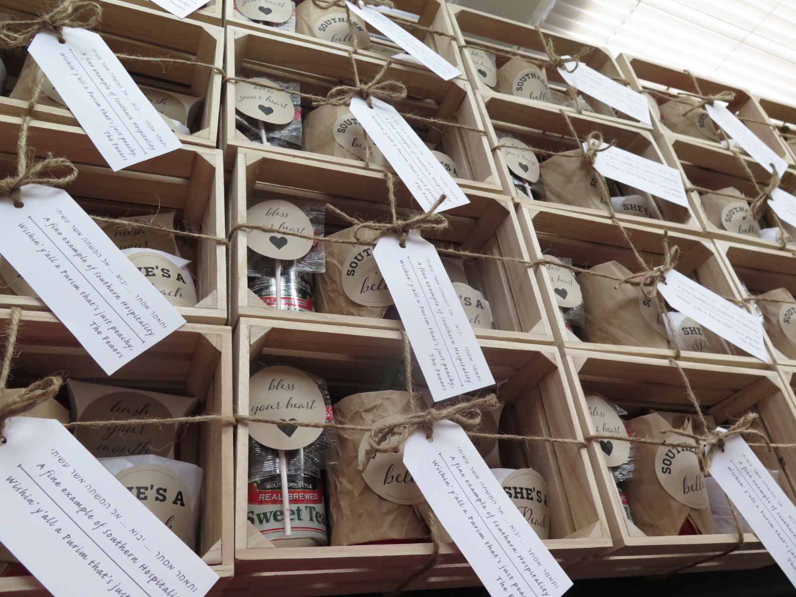 - Wooden create with twine and tag